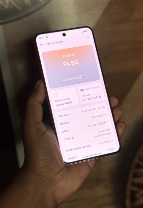 Design appears to be a strong focus for the P4 Power 5G. Leaks point to a dual-tone rear panel, with a semi-transparent upper section that reveals internal-style detailing, including copper-inspired coil patterns. The lower portion is said to feature a matte finish, complemented by Realme’s Flash Dart branding. Colour options such as TransSilver, TransOrange, and TransBlue are expected to give the phone a bold, youthful personality.